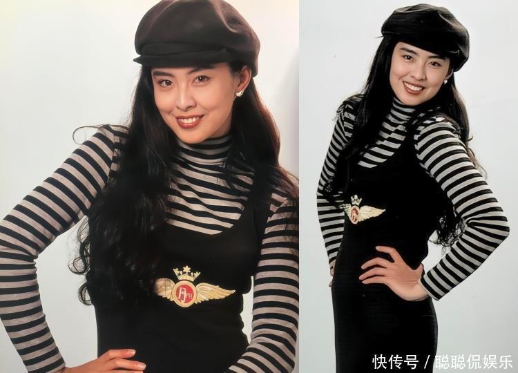 王祖贤这套造型最迷人的地方,在于「轻」与「柔」的拿捏。白色蕾丝上衣线条细致,没有过度繁复的花纹,反而保留了蕾丝原本的空气感,让视觉看起来干净而不甜腻;下身搭配浅蓝色长裙,柔软的裙摆自然垂坠,随着坐姿与动作流动,替整体增添一种从容的节奏。米白色绅士帽与花朵吊坠耳饰作为点缀,没有抢走焦点,却让造型更加完整。这样的搭配不追求明显曲线,而是用材质与色调堆栈出气质,放到现在依然是春夏非常耐看的经典组合。王祖贤穿搭公式2:条纹高领+黑色背心裙+贝蕾帽